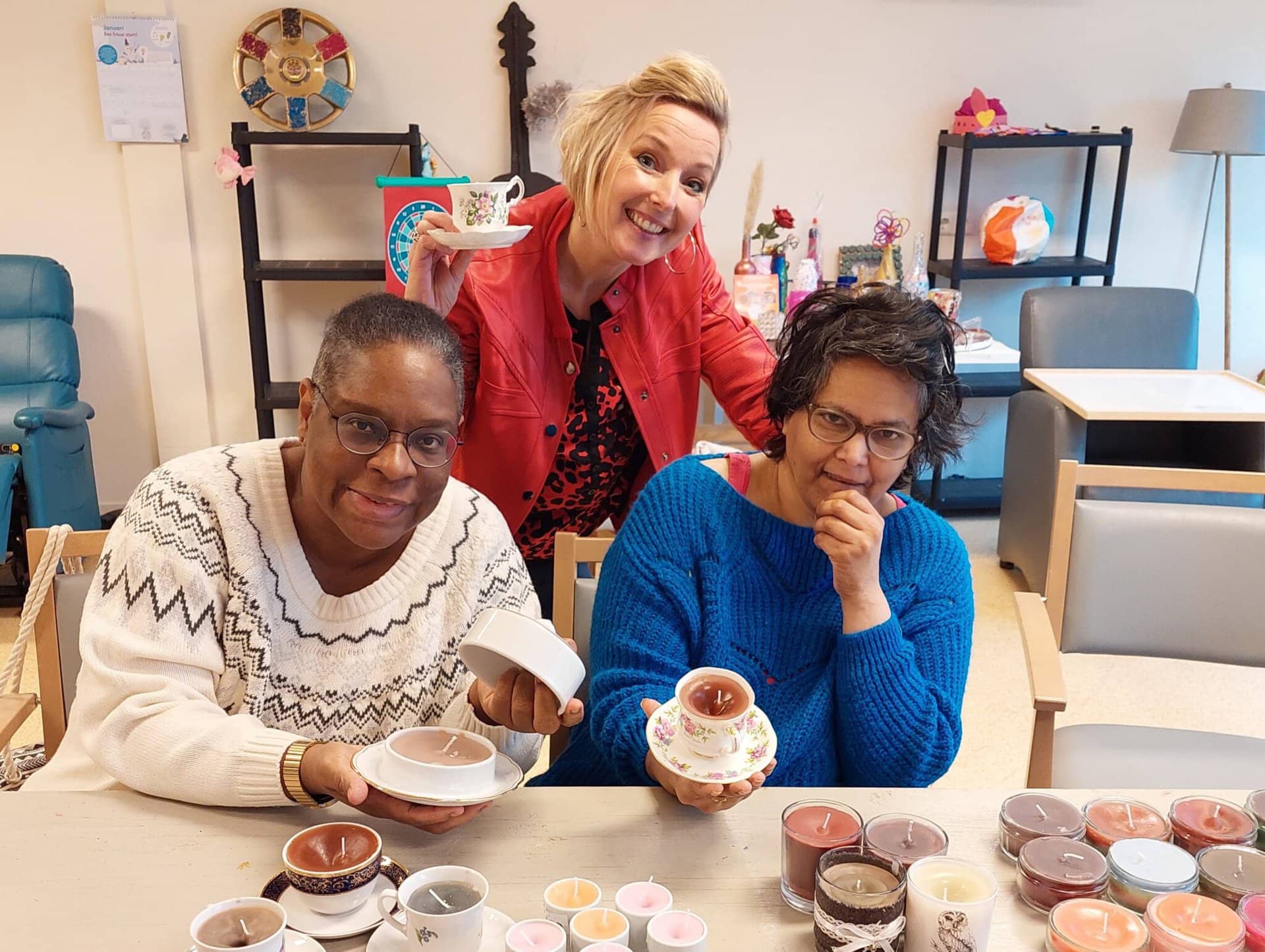 “Wij als begeleiding vinden dat ook vreselijk.” Zegt Natascha rustig. “Maar gelukkig hebben we een creatief team. We struinen in onze vrije tijd langs kringloopwinkels voor gratis servies wat we kunnen beschilderen, of we maken zoals nu kaarsen van overgebleven kaarsvet en verkopen die aan personeel zodat we op die manier weer geld verdienen om nieuwe materialen van te kunnen kopen.”